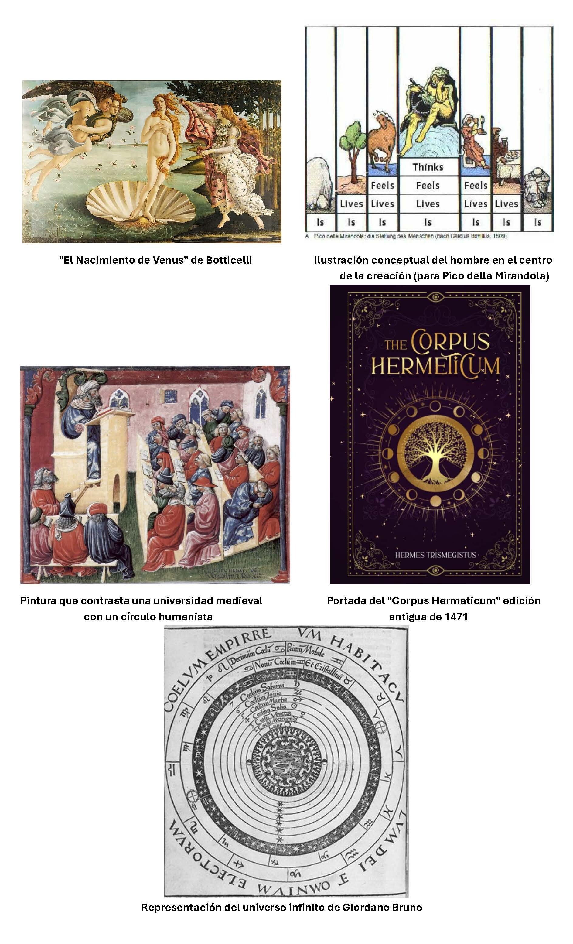 En su "Discurso sobre la Dignidad del Hombre", Pico proclama que Dios colocó al hombre en el centro del universo, sin una naturaleza fija, dándole la libertad de modelarse a sí mismo para ascender a lo divino o degradarse a lo bestial. Es el manifiesto del antropocentrismo.
